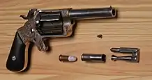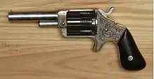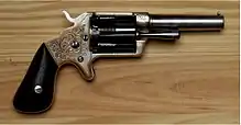 The Slocum Revolver in cal. 32 rimfire was an attempt to circumvent the Rollin White patent. This 5-shot pocket revolver was made 1864 to 1864 by the Brooklyn Arms Co, Brooklyn, New York. Total quantity is estimated to have been more than 10,000 units.[1]