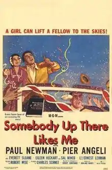 Somebody Up There Likes Me is a 1956 American drama film directed by Robert Wise and starring Paul Newman and Pier Angeli, based on the life of middleweight boxing legend Rocky Graziano.[3][4] The supporting cast features Everett Sloane, Eileen Heckart, Harold J. Stone, Sal Mineo, and Robert Loggia. Steve McQueen has a brief unbilled speaking role as Fidel.