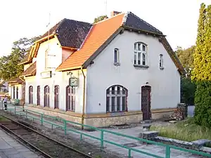 Somonino railway station is a railway station serving the town of Somonino, in the Pomeranian Voivodeship, Poland. The station is located on the Nowa Wieś Wielka–Gdynia Port railway and Somonino–Kartuzy railway. The train services are operated by SKM Tricity.