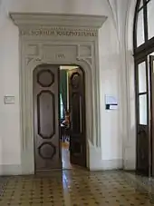 Soon after the establishment of the German occupation of Poland, following the invasion of Poland, on 19 October 1939, the Senate of the Jagiellonian University decided to open the university for a new academic year, which was to start on 13 November.[3] This decision was communicated to German occupation authorities, who did not express objections.[3] However, on 3 November, the Gestapo chief in Kraków SS-Obersturmbannführer Bruno Müller, commanded Jagiellonian University rector Professor Tadeusz Lehr-Spławiński to require all professors to attend his lecture about German plans for Polish education. The rector agreed and sent an invitation throughout the university for a meeting scheduled at the administrative center building in the Collegium Novum (entrance pictured). On 6 November 1939, in lecture room no. 66 (currently no. 56[4]) at noon, all academics and their guests gathered; among them, 105 professors and 33 lecturers from Jagiellonian University (UJ), four from University of Economics (AE) and four from Lublin and Wilno.[5][6] There were also 34 professors and doctors from University of Technology (AG),[5] who did not intend to start the academic year, and attended their own meeting in a different room.[7]