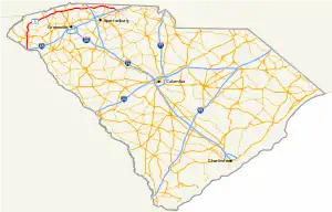 South Carolina Highway 11 (SC 11), also known as the Cherokee Foothills Scenic Highway, is a 119.850-mile (192.880 km) state highway through the far northern part of the U.S. state of South Carolina, following the southernmost peaks of the Blue Ridge Mountains. The route is surrounded by peach orchards, quaint villages, and parks. It is an alternative to Interstate 85 (I-85) and has been featured by such publications as National Geographic, Rand McNally, and Southern Living.[6]