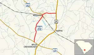 SC 212 is a two-lane rural highway that connects the town of Williams between SC 64 and U.S. Route 21 (US 21). Within Williams, it intersects SC 362 at its eastern terminus.[2]