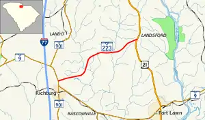 SC 223 is a two-lane rural highway that traverses from SC 9 and SC 901 north of Richburg to U.S. Route 21 (US 21) in the community of Landsford and Landsford Canal State Park.[2][3]