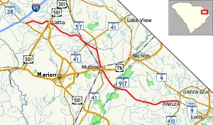 The highway travels in a southeast-to-northwest direction, but is signed as a north–south highway. It travels between SC 410/SC 9 Bus. in the community of Finklea, through Mullins where it has a concurrency with SC 41 and intersects US 76, Latta where it intersects U.S. Route 301 (US 301) and US 501, to SC 38 south of its interchange with I-95.[4]