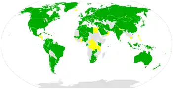 The Liability Convention was concluded and opened for signature on 29 March 1972.[1] It entered into force on 1 September 1972.[1] As of 1 January 2021, 98 States have ratified the Liability Convention, 19 have signed but not ratified and four international intergovernmental organizations (the European Space Agency, the European Organisation for the Exploitation of Meteorological Satellites, the Intersputnik International Organization of Space Communications, and the European Telecommunications Satellite Organization) have declared their acceptance of the rights and obligations provided for in the Agreement.[2][3]