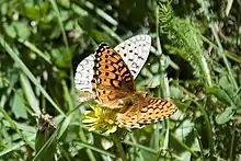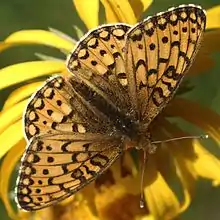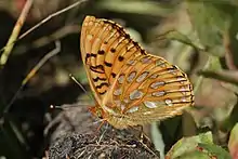 Speyeria mormonia, commonly known as the Mormon fritillary, is a North American butterfly belonging to the family Nymphalidae. It is highly diverse, having differentiated into several subspecies which occupy a wide geographic range. S. mormonia exhibits extreme protandry, which is the emergence of male adults before female adults. This has several consequences on male and female behavior.[2] Habitat specificity is still being investigated, as there are few known environmental predictors, and S. mormonia appears to be associated with a wide range of habitats. This species is not under threat, and conservation efforts are generally not necessary.[3][4]