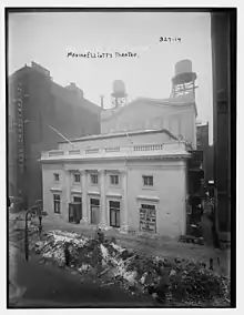 Plans for a 19-floor building occupying the plots at 107-113 West 39th Street and 104-106 West 40th Street were announced in January 1960 by the Cardiff Corporation.[12] At the time, the site was occupied by five structures, including the neoclassical-style Maxine Elliott's Theatre.[11] These plots were acquired in May 1960, and Emery Roth & Sons were designated as the building's architects. At the time, the building was to be completed in late 1961.[13] However, in late December 1960, Springs Mills bought the plot, which resulted in a delay in construction.[11] In February 1961, Springs Mills bought an additional plot of land at 102 West 40th Street.[14] With Harrison & Abramovitz selected as the architects,[11] the updated plans were filed with the New York City Department of Buildings by June.[14] Excavations had started by the time the revised plan for the Springs Mills Tower was announced to the public that November.[15]