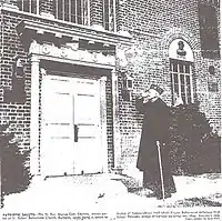In 1930, Msgr. Martin Cody Keating became pastor, a position he held for 37 years until his retirement in 1967.[2] Msgr. Keating was a chaplain in World War I and a patriot with a deep respect for the country's founding fathers, especially Thomas Jefferson.[2][6][7] After his service in World War I, Keating was assigned to a new parish in Fresno, for which he chose the name "Our Lady of Victory" (subsequently renamed St. Therese) in thanksgiving for victory in that war.[8] In August 1945, Msgr. Keating received a patent for a desk ornament of an American flag mounted on a Cross mounted on a Star of David.[9] At the St. Robert Bellarmine parish centennial in 2007, Cardinal Roger Mahony recalled that his older brother attended Bellarmine-Jefferson High School; as a boy, Cardinal Mahony would visit the campus to take his brother to school. He recalled seeing Father Keating dressed in an Army uniform for the flag raising ceremony and opening prayer.[6] "He had great devotion to his country as well as to God," Cardinal Mahony said.[6] Keating was also known as a champion of labor and war veterans.[2] In 1939, Msgr. Keating renamed the parish from Holy Trinity to St. Robert Bellarmine.[6] Msgr. Keating believed that Bellarmine's writings had been an influence on Thomas Jefferson, and that the Declaration of Independence was based on St. Robert's dictum written in 1567: "All men are equal, not in wisdom or in grace, but in the essence and nature of mankind."[2] That theory was advanced by Catholic intellectuals in the 1920s, but is rejected by modern scholars.[10] Msgr. Keating further honored the founders by using colonial architecture for all the campus buildings: church, rectory, and high school (named Bellarmine-Jefferson in joint tribute to St. Robert and Thomas Jefferson).[2]