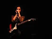 Possessing a mezzo-soprano voice,[98][99][100] Clark's music has been noted for its wide array of instruments and complex arrangements, as well as its polysemous lyrics, which have been described as teetering between "happiness and madness".[30] In response, Clark has said, "I like when things come out of nowhere and blindside you a little bit. I think any person who gets panic attacks or has an anxiety disorder can understand how things can all of a sudden turn very quickly. I think I'm sublimating that into the music."[20] In addition to guitar, Clark also plays bass, piano, organ, and theremin. Her music also often features violins, cellos, flutes, trumpets, clarinets, and other instruments.[101] Her musical style has been characterised as rock,[102][103] pop,[104][105] art rock[106][104] and indie rock,[107][108] incorporating a wide range of influences including experimental rock, chamber pop, electropop, soft rock, and cabaret jazz.[33][109]