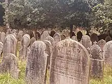 In the churchyard is a former medieval buff sandstone font with an octagonal head,[11] and a sundial dating from the late 17th century.[12] The lych gate is dated 1904. It consists of open timber framing on an ashlar plinth with a Kerridge stone-slate roof. There are stone seats down each side.[13] All these structures are listed at Grade II. In the churchyard is one of the oldest gravestones in Cheshire, dated 1596.[14] The churchyard also contains the war graves of eight soldiers and a Royal Navy sailor of World War I.[15]