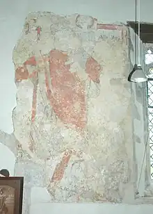 Directly opposite the door is the most significant work in St Saeran's, a huge 15th-century mural of Saint Christopher. The painting was rediscovered under plaster in 1967; this rare survival is much the finest medieval wall painting in North Wales. The saint – according to legend a giant who served as a ferryman – is shown carrying the infant Christ across a river, with a flowering staff in his hand and a shoal of fish round his feet. The patron saint of travellers, Christopher ("Christ-bearer") was often painted opposite church doorways, where wayfarers could easily glimpse his image and thus (it was believed) be preserved from "fainting or falling" all that day. The belief lives on in the Saint Christophers of modern key-rings and car dashboards.