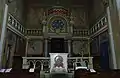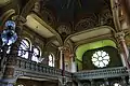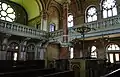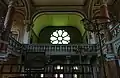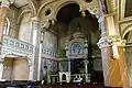 The interior of the synagogue continues in the eclectic style, remaining "luxurious, but in good taste".[8] The architectural forms are brought into relief in the profile of the various arches, the consoles, the various tracery and carved, coloured, elements. The style shows inspiration from roman, gothic and baroque architectural styles and elements, and follows patterns found in Catholic churches built during the same period. The interior is richly decorated, both in shape and in an abundance of colors: the railing for the women's gallery, built out of cylinders separated by geometric motifs, whites inside colored circles on a green background, four rose marble columns, cylindrical on an octagonal base, supporting the cupola from its sides, painted in green, yellow and orange parts on a blue and red background, the central bimah surrounded by a railing in two shades of green.