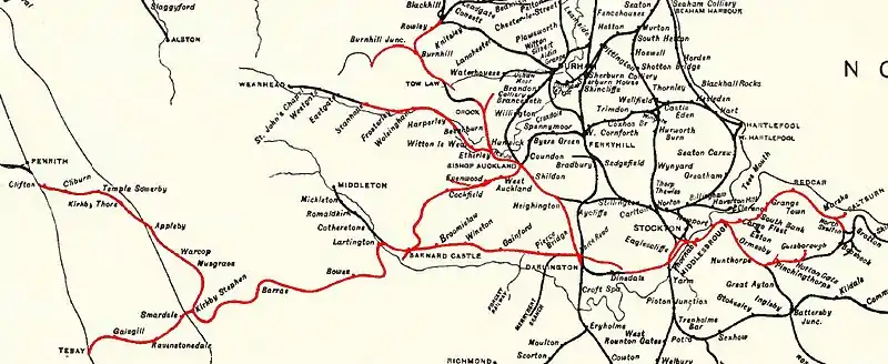 The 1955 Modernisation Plan, known formally as the "Modernisation and Re-Equipment of the British Railways", was published in December 1954. With the aim of increasing speed and reliability steam trains were replaced with electric and diesel traction.[205] From 1954 diesel multiple units took over passenger services in the north east except those on the ECML,[206] and were introduced to the line over Stainmore in February 1958.[202] The passenger service was withdrawn between Barnard Castle and Penrith on 20 January 1962,[207] and between Bishop Auckland and Barnard Castle on 12 June 1962.[208]