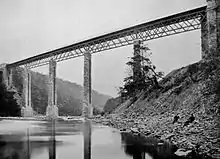 Bouch had laid out an economical route that followed the contours and avoided tunnels, but there were formidable gradients up to the 1,370-foot-high (420 m) Stainmore Summit. Land for two tracks was purchased, and a single track line was laid; valleys were crossed by viaducts, three made from wrought iron, including the Belah Viaduct, 1,040 feet (320 m) long and 196 feet (60 m) high.[168][169] A new station was built to replace the terminus at Barnard Castle.[170] A mineral train ran between Barnard Castle and Barras on 26 March 1861, and mineral traffic worked through to Tebay from 4 July 1861. There was an opening ceremony on 7 August 1861 and the SD&LUR west of Barnard Castle opened to passengers the following day.[171] Two 4-4-0 locomotives with enclosed cabs had been built for the line in 1860 by Stephenson and Co,[172] and the S&DR worked traffic from the start: two return services a day were provided for passengers. The EVR opened to mineral traffic on 8 April 1862 and passengers on 9 June 1862, to the south-facing junction at Clifton (later Clifton & Lowther). The S&DR had presented a bill in 1861 to provide better connections for passengers on the WCML by extending the line up to Penrith, and to link up with the Cockermouth, Keswick and Penrith Railway to provide access for mineral traffic to Cumberland. The L&CR agreed to allow the S&DR running rights over its line and services were extended to Penrith from 1 August 1863.[171][173]