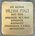 HERE LIVED WILLIAM FINZI BORN 1900 ARRESTED 10.5.1944 DEPORTED AUSCHWITZ MURDERED 7.2.1945 MAUTHAUSEN |