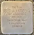 HERE LIVED RŮŽENA JUSTICOVÀ NÉE LEDEREROVÁ BORN 1905 MURDERED 1942 IN KALEVI-LIIVA ESTONIA |