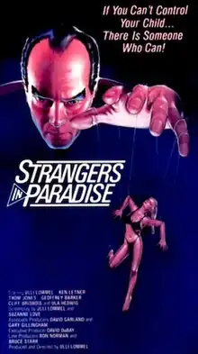 Strangers in Paradise is a 1984 American comedic science fiction musical film[3] co-written, directed by, and starring Ulli Lommel.[4] Its plot follows mesmerist Jonathan Sage, a Adolf Hitler-lookalike who survives Nazi Germany by being cryogenically preserved, only to be thawed by fascist Americans who attempt to use him to rid their community of homosexuals, free-thinkers, and other "radicals". The film was co-written by Lommel's wife, Suzanna Love, who also appears in the film as a punk singer.