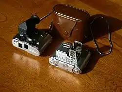 A subminiature camera is a class of camera that is very much smaller than a "miniature camera". The term "miniature camera" was originally used to describe cameras using the 35 mm cine film as negative material for still photography;[1] so cameras that used film smaller than 35mm were referred to as "sub-miniature".[2][3][4]: 11 The smallest of these are often referred to as "ultra-miniature". Lipstick cameras and other small digital cameras are not included, because they don't use film. The smaller subminiature cameras, called ultraminiature cameras, particularly Minox, are associated with spying.