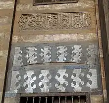 The main facade of the funerary compound is paneled with recesses crowned with a rectangular muqarnas crest, unlike the mosque façade. The main portal leads to an unusual vestibule with two opposite entrances, each with its own trilobed portals. the one on the right-hand side leading to the mausoleum and the other to the khanqah.[11] On the northwestern corner is a sabil-kuttab which projects outward into the street. The sabil, distinguished by its large metal grille windows, is located on the ground floor while the kuttab, with double-arched windows, is built above it. This sabil-kuttab configuration had first appeared in the reign of Sultan Qaytbay (r. 1468-1496).[11]