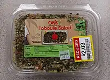 Tabbouleh (Arabic: تبولة, romanized: tabbūla), also transcribed tabouleh, tabbouli, tabouli, or taboulah, is a Levantine salad made mostly of finely chopped parsley, with tomatoes, mint, onion, soaked uncooked bulgur, and seasoned with olive oil, lemon juice, salt and sweet pepper. Some variations add lettuce, or use semolina instead of bulgur.[1][2]