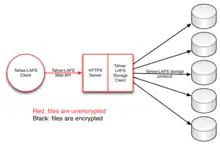 The Tahoe-LAFS Client sends an unencrypted file via a web API to the HTTPS Server. The HTTPS Server passes the file off to the Tahoe-LAFS Storage client which encrypts the file and then uses erasure coding to store fragments of the file on multiple storage drives.[13]