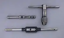 - Hand-tapper: A simple fixture analogous to an arbor press in its basic shape. Its spindle is thus held accurately perpendicular to the work. Standard taps are held in the spindle, and the operator turns the spindle manually via a handlebar. This fixture obviates the need for the operator to carefully and skillfully approximate perpendicularity, which even for a skilled operator can easily result in a 2–5° error.