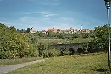 The Tauber Bridge at Rothenburg ob der Tauber is an historic road bridge that spans the Tauber Valley west of the town centre of the Middle Franconian town of Rothenburg ob der Tauber in Bavaria. The structure carries a local link road to Leuzenbronn and the Tauber Valley Way and has a 4.0 metre wide roadway and a 1.0 metre wide footpath.