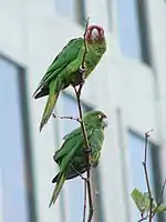 The birds, known in the bird trade as cherry-headed conures, are native to Peru and Ecuador. They have established a breeding colony with the support of some residents, as reported in the film The Wild Parrots of Telegraph Hill, and through the help of volunteers with Mickaboo Companion Bird Rescue.[14] They range widely, including along The Embarcadero and in the Presidio.