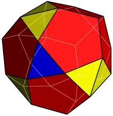 It has 28 faces: twelve regular pentagons arranged in four panels of three pentagons each, four equilateral triangles (shown in blue), and six pairs of isosceles triangles (shown in yellow). All edges of the tetrated dodecahedron have the same length, except for the shared bases of these isosceles triangles, which are approximately 1.07 times as long as the other edges. This polyhedron has tetrahedral symmetry.