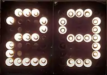 A vane display is an electro-mechanical type of 7-segment display. Unlike LED and VFD segmented displays, vane displays are composed of seven physical surfaces, typically painted white, but occasionally other colors, such as yellow or fluorescent green. If a segment is to be displayed as "off", it will be rotated so that its edge faces forward, with the painted surface pointing away and not visible. A segment that is to be displayed as "on" will be rotated so that the painted surface is shown.