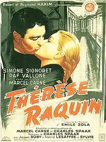 Thérèse Raquin (also The Adultress) is a 1953 French-Italian drama film directed by Marcel Carné and starring Simone Signoret, Raf Vallone and Jacques Duby.[1] The story is loosely based on the 1867 novel of the same title by Émile Zola but with the setting updated to 1953.[2] It was shot at the Neuilly Studios in Paris and on location in Lyon. The film's sets were designed by the art director Paul Bertrand. It was screened at the 14th Venice International Film Festival where it won the Silver Lion.