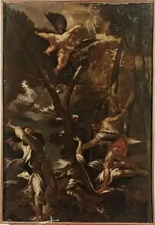 In 1528 Titian took part in a competition with Il Pordenone and Palma il Vecchio for the commission for a large altarpiece showing the martyrdom of Saint Peter Martyr for the altar of that saint's confraternity in San Zanipolo, the main Dominican centre in Venice.[1] Titian won the commission, in part since the Dominicans did not want to be outdone by the Franciscans, who already had Titian's Assumption and Pesaro Altarpiece, both at the basilica dei Frari.[1] The new work was delivered on 27 April 1530.