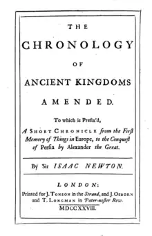 The Chronology of Ancient Kingdoms Amended is a work of historical chronology written by Sir Isaac Newton, first published posthumously in 1728.[1] Since then it has been republished. The work, some 87,000 words, represents one of Newton's forays into the topic of chronology, detailing the rise and history of various ancient kingdoms throughout antiquity.