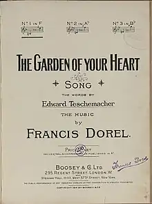 "The Garden of Your Heart" is a song composed by Francis Dorel and Edward Teschemacher. The first and only known recording was by American tenor Charles Harrison in 1916 for Columbia Records. This song is mentioned in the ragged trousered philanthropist, a book from 1913, being played on a Polyphone, a very early type of Jukebox