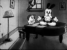![]() The girl beagle plays the piano while Oswald sings It Ain't Gonna Rain No Mo'. | |