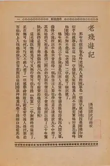 The first 13 chapters were serialized in the bi-weekly Xiuxiang Xiaoshuo (simplified Chinese: 绣像小说; traditional Chinese: 繡像小說; Illustrated Fiction) from March 1903 to January 1904, in issues 9 through 18. It was published in the Tianjin Riri Xinwen Bao (simplified Chinese: 天津日日新闻报; traditional Chinese: 天津日日新聞報; lit. 'Tientsin Daily News'[4]) in a 20 chapter version with a prologue.[5]
