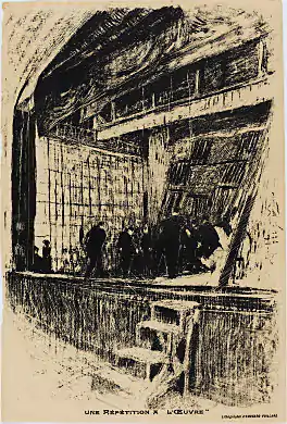 A lithograph by Édouard Vuillard depicting a rehearsal on the stage of the Théâtre de l'Œuvre. The print was used as a program for the play "L'Oasis" by Jean Jullien on December 14, 1903 and for a different production in 1908.
