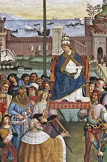 In early 1462, Thomas left to Rome to tour Italy and drum up support for a crusade,[40] carrying with him papal letters of indulgence.[38] Thomas brought with him letters by Pius II who described him as "a prince who was born to the illustrious and ancient family of the Palaiologoi ... a man who is now an immigrant, naked, robbed of everything except his lineage".[38] Like his father Manuel II and his brother John VIII before him, Thomas's possessed a certain royal charisma and good looks, which ensured that his appeals did not fall on deaf ears. The Mantuan ambassador to Rome described him as "a handsome man with a fine, serious look about him and a noble and quite lordly bearing" and Milanese ambassadors who encountered him in Venice wrote that Thomas was "as dignified as any man on Earth can be". Of the many courts Thomas visited, serious objections to his appeal was made only by Venice, where the local senate made it clear that they wanted nothing to do with him. Not only did they make Thomas leave the city, but they sent ambassadors to Rome to request that he not accompany the expedition because his presence would "produce terrible and incongrous scandals". The reason for Venice's wrath against Thomas might be his advances on Venetian territories during his time as despot, or the fact that his quarreling with his brother Demetrios effectively doomed the Morean despotate. Despite Thomas' hopes, no expedition set out for Greece. When the army was ready to set sail in 1464, Pius II travelled to Ancona to join the crusade, but died there on 15 August. Without Pius II's leadership, the crusade disbanded almost immediately, with all the ships returning home one by one.[40]