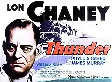 Thunder is a 1929 American synchronized sound melodrama film starring Lon Chaney and directed by William Nigh. The film has no audible dialogue but featured a synchronized musical score and sound effects. The soundtrack was recorded using the Western Electric Sound System sound-on-film process. The soundtrack was also transferred to discs for those theatres that were wired with sound-on-disc sound systems. [2] Thunder was Chaney's penultimate film appearance and his last film without audible dialogue.[3]