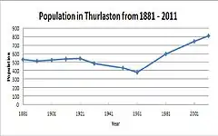 Census data extends Thurlaston's population history back to 1881, with a population of 533. The population remained stable with little fluctuation until a decline to 378 during the 1961 census, however following this a steady growth saw the total rise to today's figure of 807, the highest figure so far recorded.