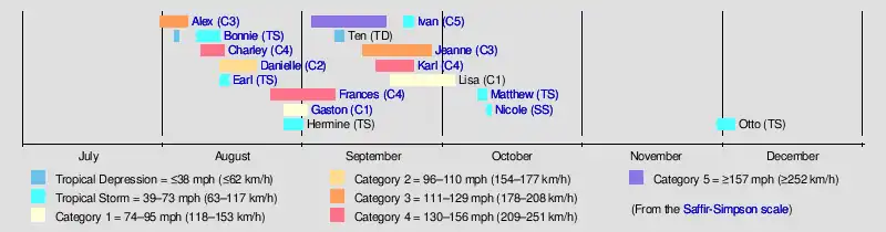 This season had 16 tropical depressions, of which, 15 became named storms. Of these, 9 strengthened into hurricanes with 6 intensifying into major hurricanes.[nb 1] The most noteworthy storms for the season were the five named storms that made landfall in the U.S. states of Florida and Alabama, three of them with at least 115 mph (185 km/h) sustained winds (major hurricane strength): Tropical Storm Bonnie, Charley, Frances, Ivan, and Jeanne. This is the only time in recorded history that four hurricanes affected the U.S. State of Florida although one of the four, Ivan, brought hurricane-force winds to the state without making a landfall there.[2]