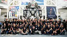 Pre-production began in 2011, and Respawn's first game was originally planned for seventh generation consoles.[30] The idea for the game did not come easily, and the team arrived at its multiplayer-only and human-mech focus after much internal debate.[30] The team started with open collaboration about games and game mechanics they found exciting, and no market research.[28] Respawn artist Joel Emslie recalled starting with a human-sized suit as a "second skin", which the designers grew in size.[30] As Respawn didn't have the necessary computers, the artists resorted to kitbashing and model making[31]—Emslie prototyped by putting a figurine inside a plastic model kit.[30] The team progressed to detailed, foot-high "mechettes" made of wood, wire, and plastic, which became the Atlas Titan.[28] Project influences include Blade Runner, Star Wars, Abrams Battle Tank,[31] and Masamune Shirow of Ghost in the Shell.[32] Emslie refers to the aesthetic as a "used future".[33] Their production was unconventional, similar to Infinity Ward's old practices, and the game lacked design documentation.[28] At E3 2011, Electronic Arts Labels president Frank Gibeau revealed that Respawn's first project was a science fiction shooter published by Electronic Arts.[25] Two project leads left the company to begin their own studio in mid-2012,[note 2] and West retired in March 2013.[25]