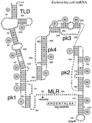 A prominent feature of every tmRNA is the conserved tRNA-like domain (TLD), composed of helices 1, 12, and 2a (analogs of the tRNA acceptor stem, T-stem and variable stem, respectively), and containing the 5' monophosphate and alanylatable 3' CCA ends. The mRNA-like region (MLR) is in standard tmRNA a large loop containing pseudoknots and a coding sequence (CDS) for the tag peptide, marked by the resume codon and the stop codon. The encoded tag peptide (ANDENYALAA in E. coli) varies among bacteria, perhaps depending on the set of proteases and adaptors available.[9]