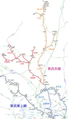 Isesaki Line | ![]() | Tōbu-Dōbutsu-Kōen – Isesaki | 75.1 km (46.7 mi) |