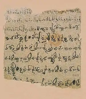 Most of attested Tocharian was written in the Tocharian alphabet, a derivative of the Brahmi alphabetic syllabary (abugida) also referred to as North Turkestan Brahmi or slanting Brahmi. However a smaller amount was written in the Manichaean script in which Manichaean texts were recorded.[38][39] It soon became apparent that a large proportion of the manuscripts were translations of known Buddhist works in Sanskrit and some of them were even bilingual, facilitating decipherment of the new language. Besides the Buddhist and Manichaean religious texts, there were also monastery correspondence and accounts, commercial documents, caravan permits, medical and magical texts, and one love poem.