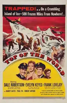 Top of the World is a 1955 American aviation adventure film, directed by Lewis R. Foster, and written by John D. Klorer and N. Richard Nash.[1] The film starred Dale Robertson,[2] Evelyn Keyes,[3] Frank Lovejoy,[4] Nancy Gates,[5][6] Paul Fix,[2][7] Robert Arthur,[8][9][10] and Peter Hansen.[2] Composer Albert Glasser composed the music to the film.[11]