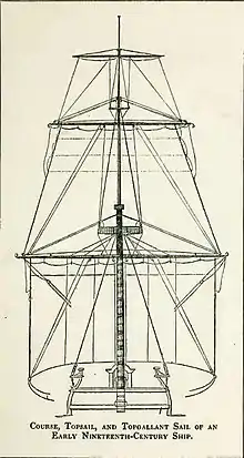 • A yard topsail is similar, but set on a yard. Early 19th-century topsail yards were set almost horizontally, but gradually increased in angle until they became almost vertical extension of the topmast.[7]