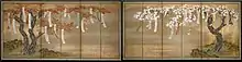 Flowering Cherry and Autumn Maples with Poem Slips[25] | Ink and color, Gold and Silver | 2 x 6 Panel Folding screens | 144x286 (panel) | Tosa sakon shogen Mitsuoki hitsu | 1654-81 | Art Institute of Chicago | ![]() Tosa Mitsuoki - Flowering Cherry and Autumn Maples with Poem Slips - Google Art Project |