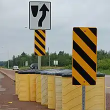 A Fitch Barrier is an energy-absorbing type of impact attenuator consisting of a group of sand-filled plastic barrels, usually yellow in color with a black lid.[16] Fitch barriers are often found in a triangular arrangement at the end of a guard rail between a highway and an exit lane (the area known as the gore), along the most probable line of impact. The barriers in front contain the least sand, with each successive barrel containing more. When a vehicle collides with the barrels, the vehicle's kinetic energy is dissipated by the shattering of the barrels and the scattering of the sand inside, and the vehicle decelerates over a longer period of time instead of sudden and more violent rapid deceleration from striking a solid obstruction. In turn, the risk of injury to the vehicle occupants is greatly reduced. Fitch barriers are widely popular due to their effectiveness, low cost, and ease of setup and repair or replacement.[17]