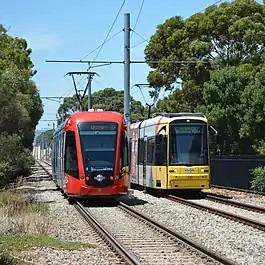 ![]() The two models of tram introduced for Adelaide's tramways revival: 200 Series, Alstom Citadis (left) and 100 Series, Bombardier Flexity Classic, on the 9.25 kilometres (5.75 miles) reserved line between Adelaide and Glenelg | |||||||||||||||||||||||||||||||||||||||||||||||||||||||||||||||||||||||||||||||||||||||||||||||||||||||||||||||||||||||||||||||||||||||||||||||||||||||||||||||||||||||||||||||||||||||||||||||||||||||||||||||||||||||||||||||||||||||||||||||||||||||||||||||||||||||||||||||||||||||||||||||||||||||||||||||||||||||||||||||||||||